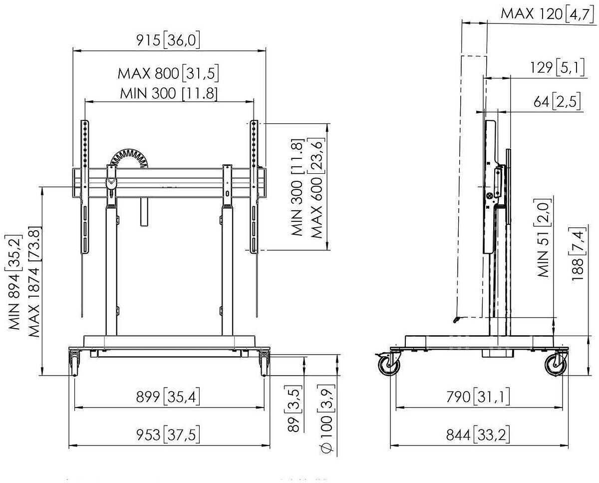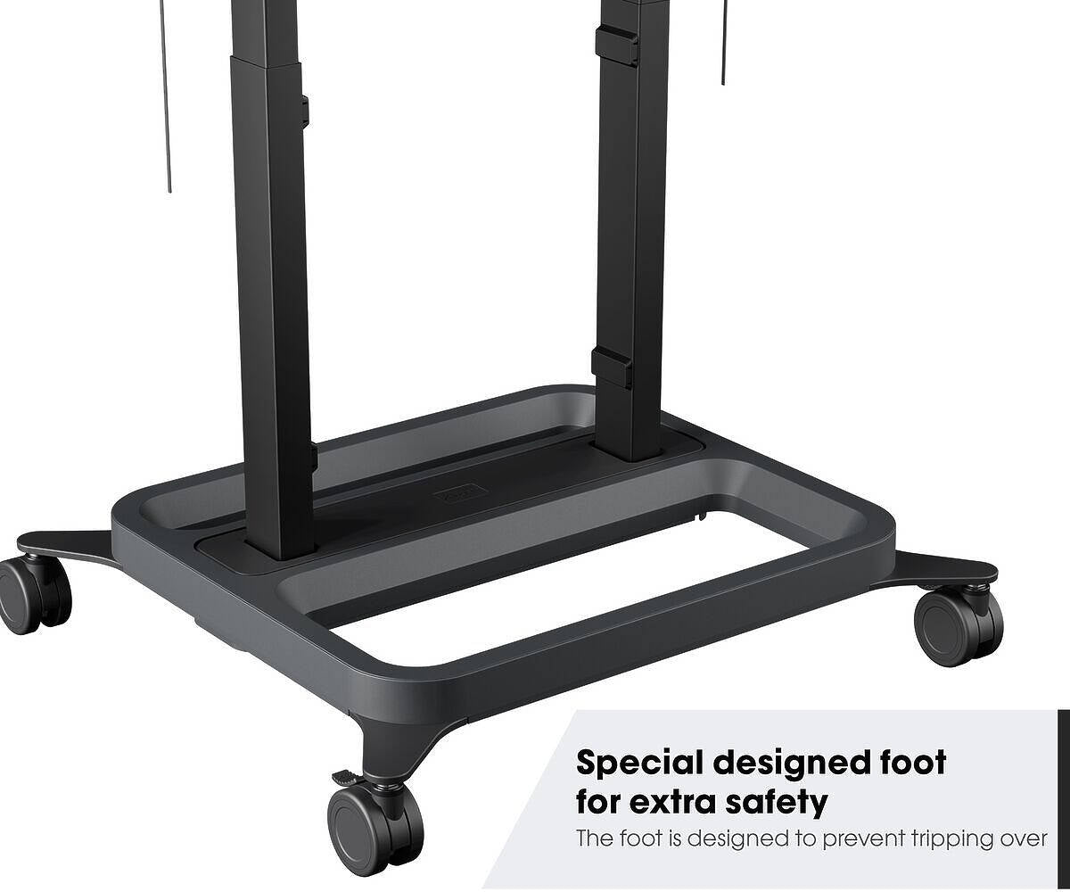 The base construction is designed for extra safety and prevents you from tripping over it. Thanks to the sturdy 100mm swivel castors, the lift can be moved easily over any surface, whether it is a PVC floor, a stone floor or a deep pile carpet. Anti collision on the display lifts prevent the screen and system from damage, in case of obstruction the lift moves back in opposite direction.