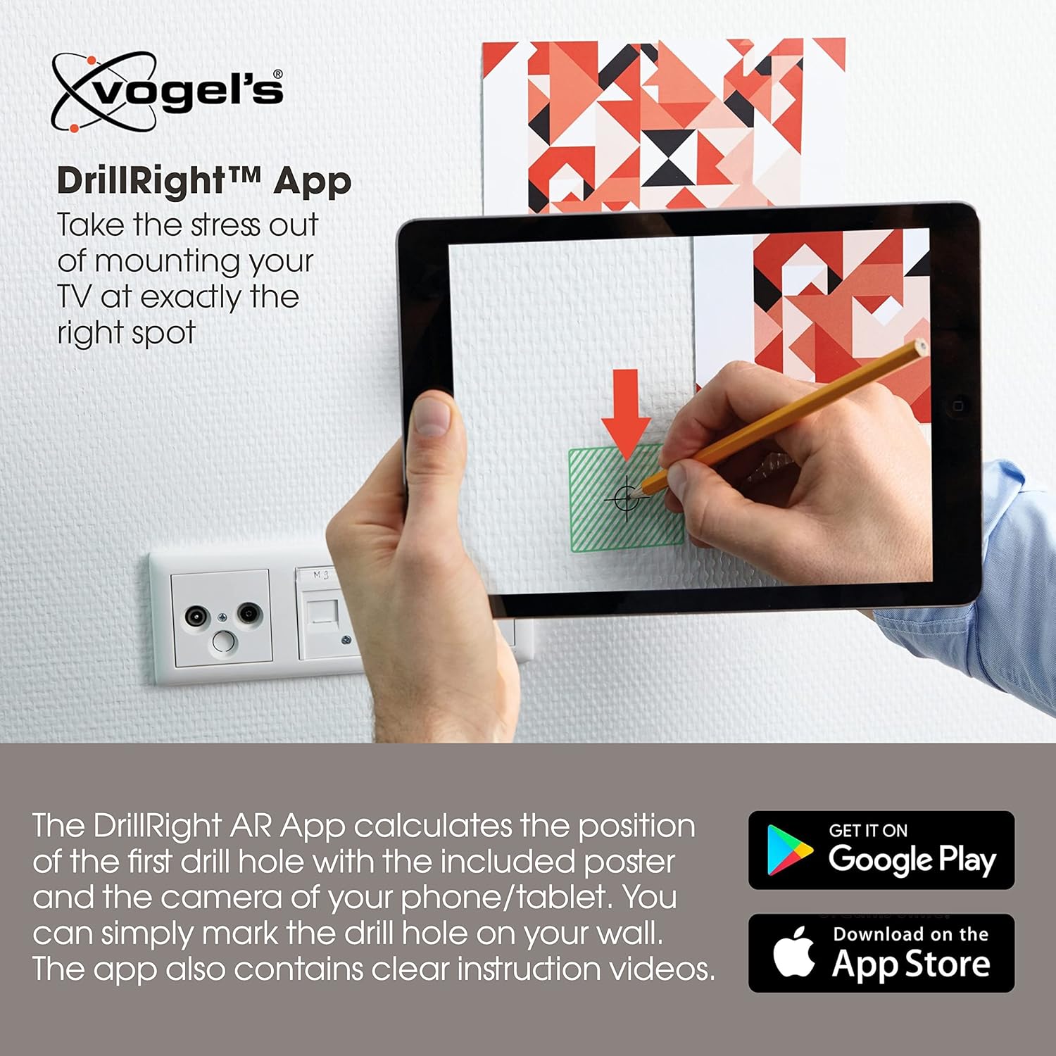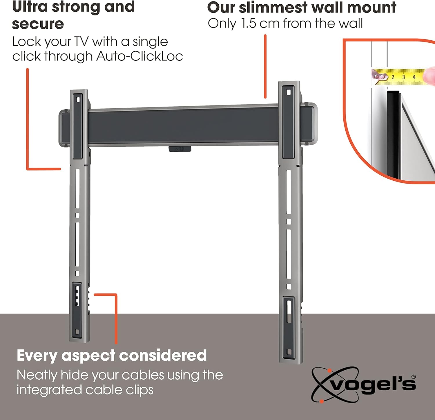 Want to mount your large, premium TV as flat as possible against the wall? The ELITE Fixed TV wall mount from Vogel's is definitely the best choice. This ultra-slim wall mount excels in terms of design and performance. Mount your TV just 1.5 cm from the wall. Vogel's ELITE Fixed is a TV wall mount with no turn or tilt function, perfect for viewing directly in front of your TV. The wall mount is suitable for TVs from 32 to 77 inches in size and weighing up to 75 kg. The ultra-strong ELITE Fixed TV wall mount is guaranteed for 15 years, tested to three times its maximum weight capacity and TüV certified. Thanks to the Auto-ClickLoc™ safety system, your TV locks securely to the wall mount with an audible click. Cables can be neatly tucked away using the cable clips, and thanks to the special maintenance mode, you can still easily access the connections of your TV after installation. In the 100% recyclable packaging, you will find all necessary mounting materials: a drilling template, screws and fischer® DuoPower plugs. The wall mount itself has a built-in spirit level. With the free Vogel's DrillRight™ AR App, it's easy to mark out your first drill hole. Thanks to its future-proof design and high-quality materials, Vogel's ELITE Fixed is a durable solution. The TV wall mount delivers a long lasting service life, and the packaging contains no EPS (Styrofoam), 95% less plastic and is 100% recyclable. 15-year guarantee.