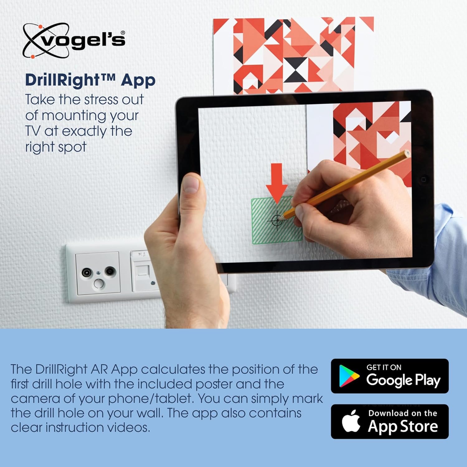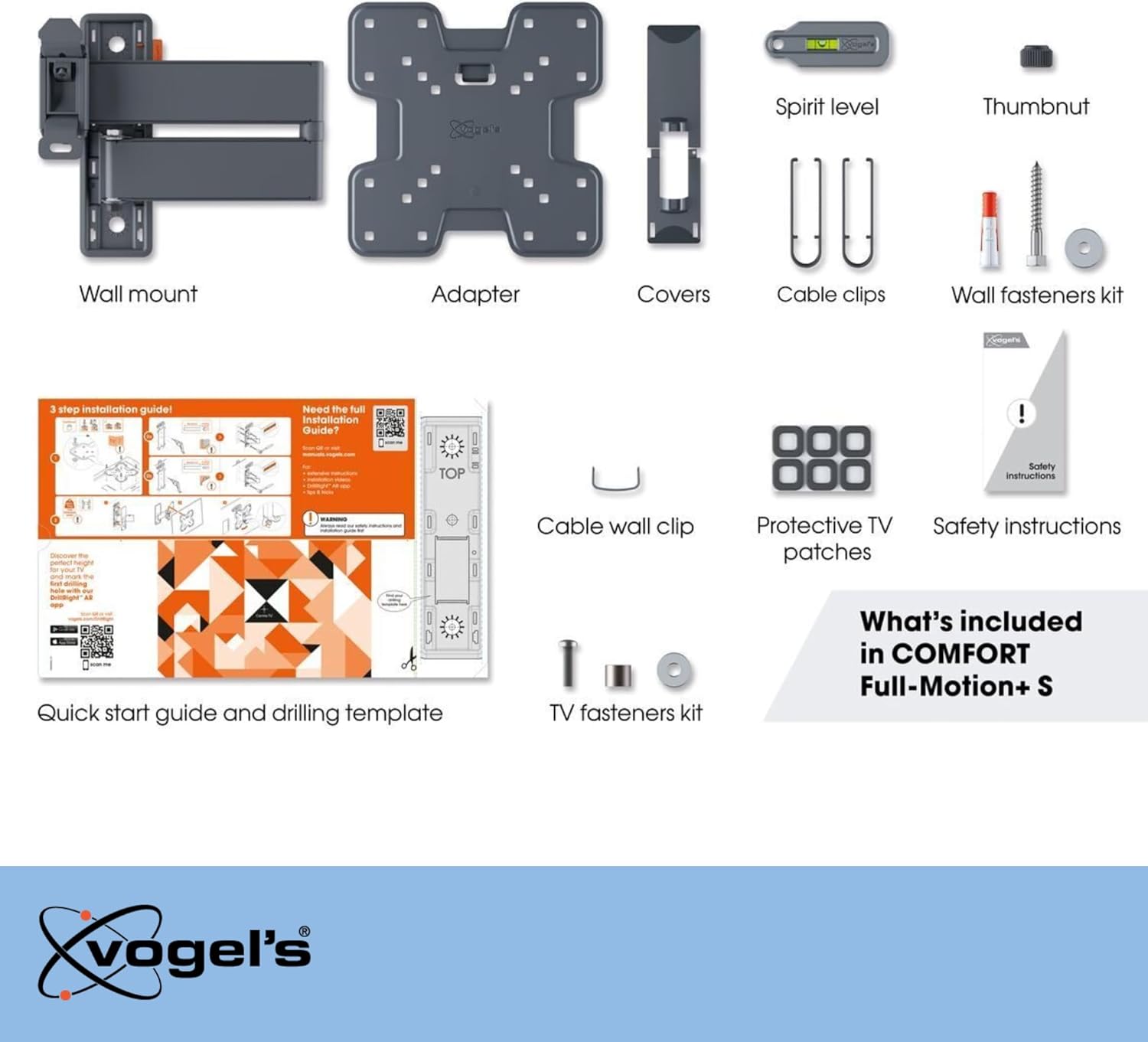 You can easily install the COMFORT Full-Motion+ TV wall mount yourself. A drilling template, screws, Fischer® DuoPower plugs, cable ties and spirit level are already included in the packaging. That's handy. And to mark out the first drill hole, simply use our free DrillRight™ AR App. You can find concise and clear installation instructions in the Quick Installation Guide. You can also find a detailed manual and installation video online.